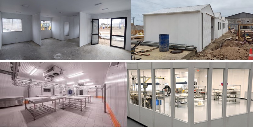 Nuestras salas de proceso son armables, desarmables y ampliables fácilmente. Construcción en base a paneles térmicos sobre estructuras metálicas, minimizando posibilidades de incendios. En fotos podrá apreciar módulos separados para cada proceso esto es una gran ventaja para obtener resolución sanitaria ante el Minsal, en plantas mayores se están instalando módulos dentro se ellas para simplificar este trámite. Normalmente tienen módulo separados para bodegas de materias primas, sala de proceso, sala de envasado, baños ( personal que trabaje en sala de proceso deba tener baños exclusivos), productos terminados, cámaras de frío, oficinas etc.